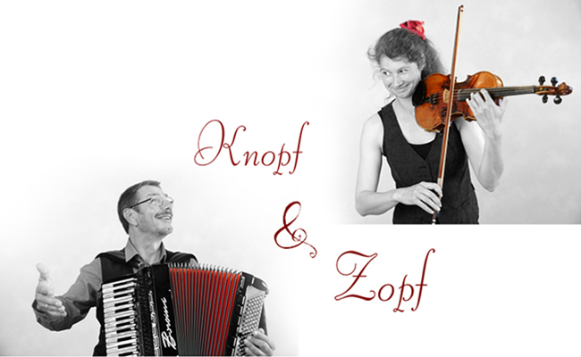 Knopf & Zopf, das sind Karoline Frick (Violine, Nyckelharpa, Mandoline, Stepptanz) und Gunnar Rieck (Akkordeon mit erweiterten elektronisch abspielbaren Klängen: Kontrabass, Gitarre...)