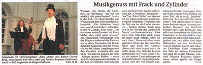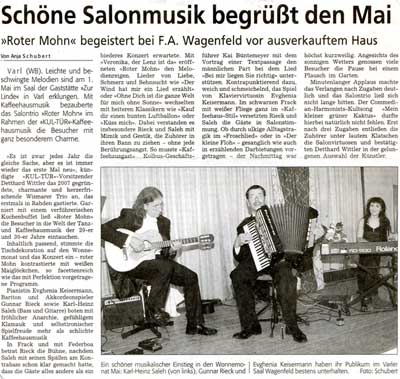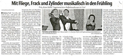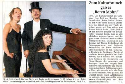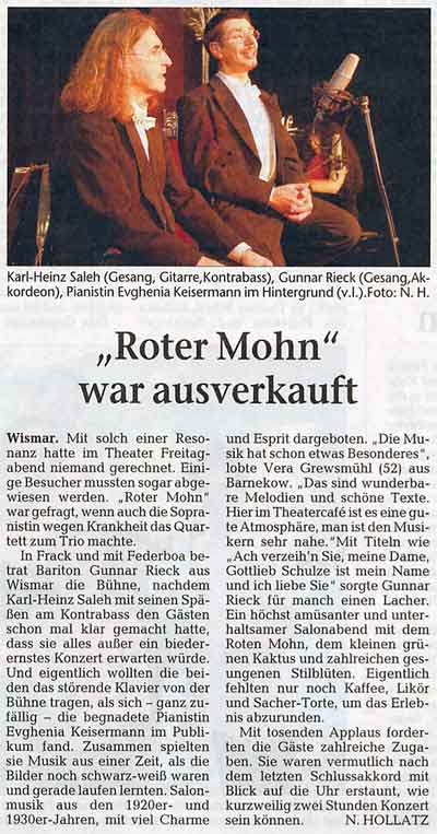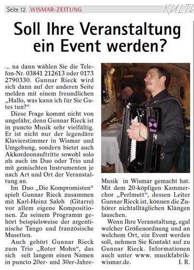 Travemünde 28.03.2009 | Bevor es in Travemünde so richtig losgeht, sieht es schon richtig spannend aus. In der Alten Vogtei stand Musik voller Leichtigkeit ins Haus, sprühende Lebensfreude ist angesagt von der französischen Musette bis hin zum argentinischen Tango. Das haben Gunnar Rieck und Karl-Heinz Saleh von der Musikfabrik vom Feinsten rübergebracht.
