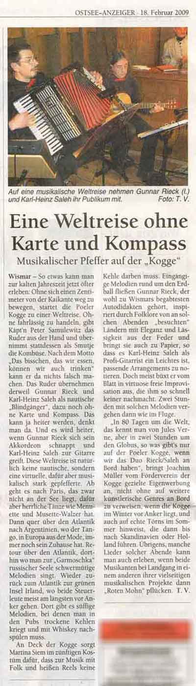 An Deck der Kogge sorgt Martina Siem im zünftigen Kostüm dafür, dass zur Musik mit Folk und heißen Reels keine Kehle darben muss. Eigenhändige Melodien rund um den Erdball fließen Gunnar Rieck, der wohl zu Wismars begabtesten Autodidakten gehört, inspieriert durch Folklore von an solchen Abenden "besuchten" Ländern mit Eleganz und Lässigkeit aus der Feder und bringt sie auch zu Papier, so dass es Karl-Heinz Saleh als Profi-Gitarrist ein Leichtes ist, passende Arrangements zu notieren. Doch meist büxt er vom Blatt in virtuose freie Improvisation aus, die ihm so schnell keiner nachmacht.