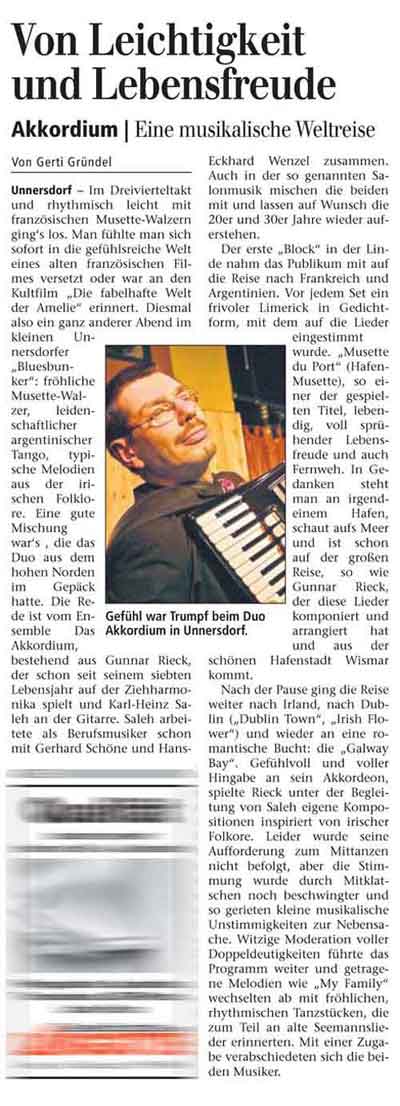 ...In Urlaubsstimmung kam die Zuhörerschaft in der Bahnhofskneipe bei argentinischen Tango- und französischen Chanson-Melodien. Bei teilweise verswingten irischen Melodien und Tänzen hätte laut Saleh normalerweise getanzt werden dürfen. Doch das bequeme Volk konzentrierte sich lieber sitzend auf die vollen Gitarrenklänge und das Akkordeonspiel von Gunnar Rieck. Wer sich über die vollen Bass-Töne wunderte, wurde von Saleh bald aufgeklärt: „Der Bass kommt aus dem Akkordeon. Das war ganz schön teuer, sag ich euch.“Wenn sich die beiden Ausnahmekünstler durch Sprüche wie „Der eine spielt falsch, der andere nicht richtig, aber das ist nicht wichtig“ immer wieder aufs Korn nahmen, wurden die Lachmuskeln der Zuhörer trainiert.