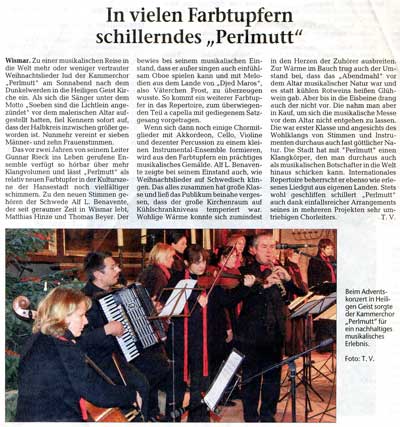 Wismar. "Zwei Länder - zwei Chöre": Ein außergewöhnliches Konzert erlebten etwa 60 Zuhörer am Sonnabendvormittag im Wismarer Rathaus. "Jazz'n others" aus der schwedischen Hauptstadt Stockholm und "Perlmutt" aus Wismar sangen im Bürgerschaftssaal. Als "kleinen Chorkampf" bezeichnete - mit Augenzwinkern - Alf Benavente die fröhliche, kurzweilige Veranstaltung. Der Schwede, der in Wismar wohnt und einst bei "Perlmutt" sang, hatte das Treffen im Namen der deutsch-schwedischen Gesellschaft der Hansestadt Wismar organisiert. Der Kammerchor "Perlmutt", 2007 gegründet, die Leitung hat Gunnar Rieck (45), begeisterte mit Liedern in deutscher, englischer und schwedischer Sprache, darunter auch Klassiker der Musikgeschichte. Die zehn Sängerinnen und Sänger von "Jazz'n others" brachten, von Per-Olof Losvall (65) am Keyboard begleitet, unter anderem ABBA-Songs zu Gehör.