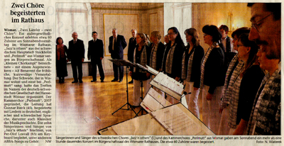 Bildunterschrift: Sängerinnen und Sänger des schwedischen Chores "Jazz'n others" (l.) und des Kammerchores "Perlmutt" aus Wismar gaben am Sonnabend ein mehr als eine Stunde dauerndes Konzert im Bürgerschaftssaal des Wismarer Rathauses. Die etwa 60 Zuhörer waren begeistert.